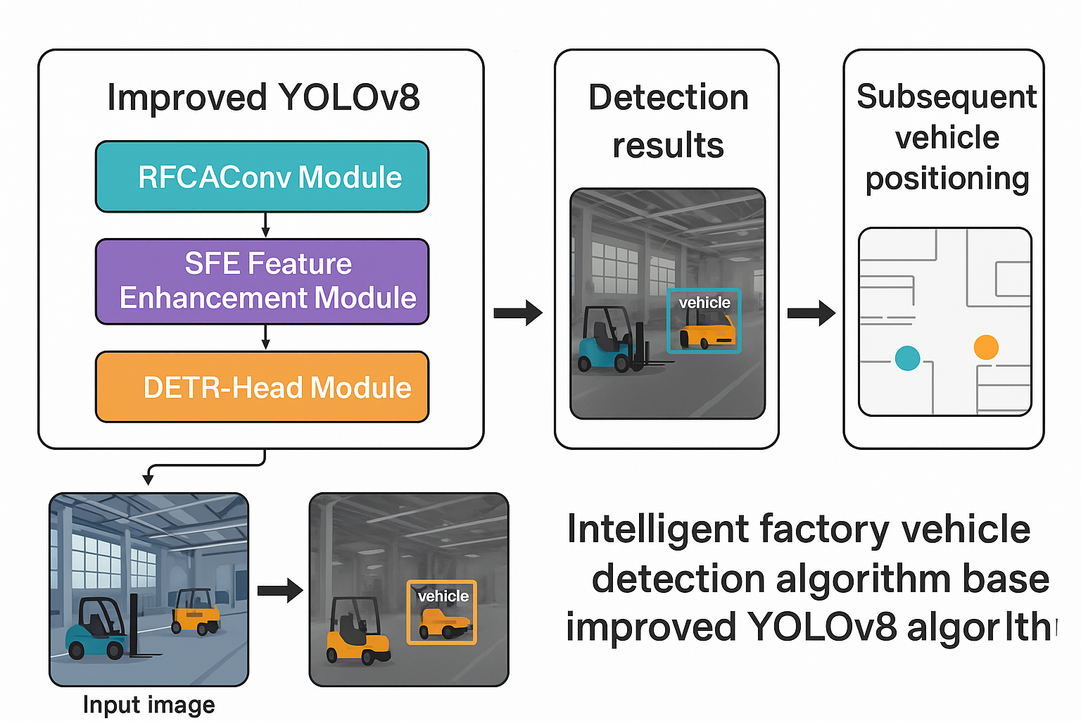 Aiming at the problem that the existing algorithms for vehicle detection in smart factories are difficult to detect partial occlusion of vehicles, vulnerable to background interference, lack of global vision, and excessive suppression of real targets, which ultimately cause accuracy degradation. At the same time, in order to facilitate the subsequent positioning of vehicles in the factory, this paper proposes an improved YOLOv8 algorithm. Firstly, the Receptive-Field Coordinated Attention Convolutional(RFCAConv) is combined to improve the original YOLOv8 backbone. Pay attention to the different features in the receptive field, and give priority to the spatial features of the receptive field to capture more vehicle feature information and solve the problem that the vehicle is partially occluded and difficult to detect. Secondly, the Scattering Feature Enhancement(SFE) module is added to the neck of v8, which improves the saliency of the target in the reasoning process and reduces the influence of background interference on vehicle detection. Finally, the head of the RT-DETR algorithm is used to replace the head in the original YOLOv8 algorithm, which avoids the excessive suppression of the real target while combining the context information. The experimental results show that compared with the original YOLOv8 algorithm, the detection accuracy of the improved YOLOv8 algorithm is improved by 4.6% on the self-made smart factory data set, and the detection speed also meets the real-time requirements of smart factory vehicle detection and subsequent vehicle positioning.